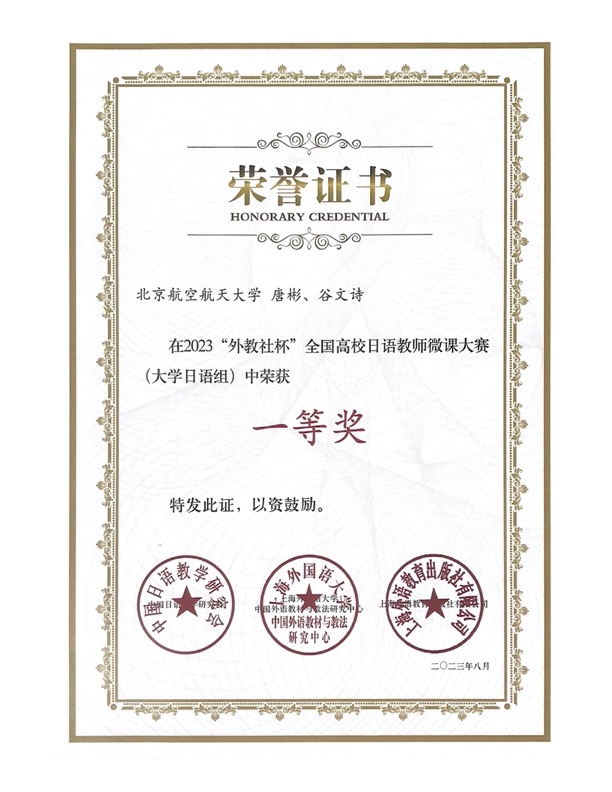 在学院的大力支持下,今年会jinnian官网日语团队的两位青年教师唐彬和谷文诗,充分运用现代化教学手段,生动地呈现了教学内容,同时有机地融入了课程思政元素,展现出北航日语教学的工科特点和“空天报国”的教学理念。在激烈的竞争中,她们的微课作品从180个参赛作品中脱颖而出,荣获全国一等奖,彰显了今年会jinnian官网日语教师扎实的专业功底和出色的信息技术应用能力,为北航日语教育的卓越品质增光添彩。