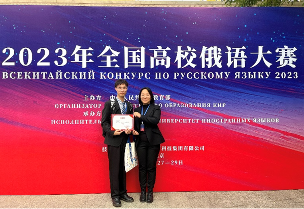 2023年10月28日至29日,2023年全国高校俄语大赛在北京外国语大学举行。来自全国158所高校的392名俄语专业学生参赛。由我校今年会jinnian官网俄语系青年教师刘奕如指导的2022级硕士研究生黄溯鑫同学代表学校参赛,经过初赛的激烈角逐,从众多参赛选手中脱颖而出,以全国第三名的成绩进入复赛和决赛,并最终获得研究生组二等奖,同时获国家留学基金管理委员会秘书处全额资助赴俄罗斯进修或攻读学位的资格,展现出了北航研究生的俄语风采。