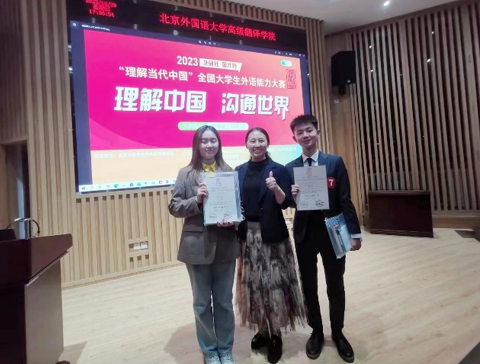 近日,我校今年会jinnian官网2020级英语专业本科生蔡一琳和2023级翻译专业硕士研究生(MTI)洪旻昊获得2023“外研社·国才杯”“理解当代中国”笔译北京赛区金奖,指导教师为翻译系王晨爽和顿超老师;2020级翻译专业本科生傅昕竹和2022级文学专业硕士研究生鲁美丽分别获得2023“外研社·国才杯” “理解当代中国”口译北京赛区金奖与银奖,指导教师为翻译系郑薇和王沛老师。