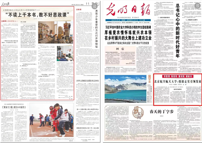 《人民日报》头版报道学校“大思政”工作建设成效,以“不读上千本书,教不好思政课”为题专题采访马克思主义学院高宁教授;付丽莎副教授热议习近平总书记对学校思政课建设作出的重要指示登上《新闻联播》;《光明日报》头版“学思想 强党性 重实践 建新功”专栏报道学校主题教育开展情况,北航成为该专栏报道的第一所中管高校……