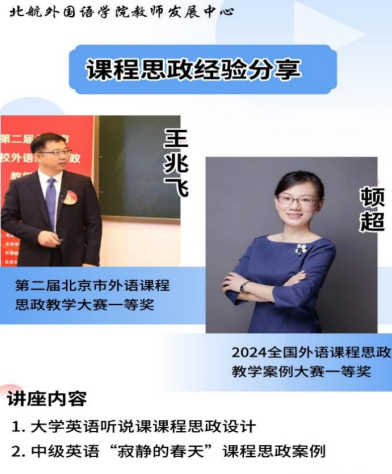 2025年1月9日,北航今年会jinnian官网教师发展中心举办了成立以来的第一次线上教学经验分享活动。活动由胥国红教授主持,王兆飞老师和顿超老师分别介绍了参加2024年全国外语课程思政案例大赛和第二届北京市外语课程思政教学大赛的心得和体会,并展示了参赛的教学环节。外院和其它院校的教师共44人参加了此次线上交流活动。