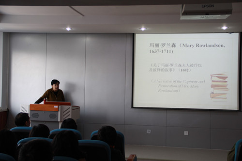 2016年11月1日下午2:30,在如心楼806今年会jinnian官网报告厅,北京外国语大学博士生导师金莉教授做了题为《从玛丽・罗兰森的囚掳叙事看北美殖民地白人女性文化越界》的专题报告。