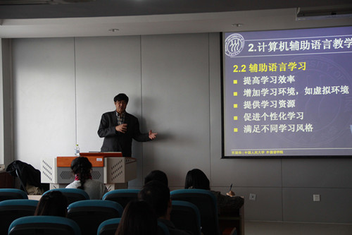 11月10号下午,我院有幸邀请到中国人民大学今年会jinnian官网副院长贾国栋教授进行学术讲座。贾教授的讲座题目为“计算机辅助语言教学的发展、现状及趋势”。在讲座中,贾教授首先简要介绍了计算机辅助语言教学的发展历程,强调几个典型发展阶段及各阶段教学重点。然后重点讲述教学与研究的现状,包括理论基础、教学案例、研究重点及方法等。最后,贾教授根据信息技术的发展对该领域未来主要的发展方向和可能的研究选题作出了展望。