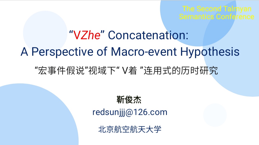 北京航空航天大学博士生靳俊杰的报告“‘V Zhe (着)’ Concatenation: A Perspective of Macro-event Hypothesis”基于历时语料库对比分析了表征具有时间关系的两个(子)事件的“V着”连用式,并基于小句分层结构模型与连接类型框架探讨了“V着”连用式四种变体间及各变体内部的句法关系。他认为,“V着”连用分布在元明、清代及现代,且“V着”四种变体呈现由非宏事件演变为宏事件的连续统;原型句法关系类型呈现“小句并列(V1着,V2着) →小句并列从属(V1着,V1着) →核心并列(V1着V2着) →核心并列从属(V1着V1着)”的句法梯度连续统。该研究支持了“宏事件假说”。
