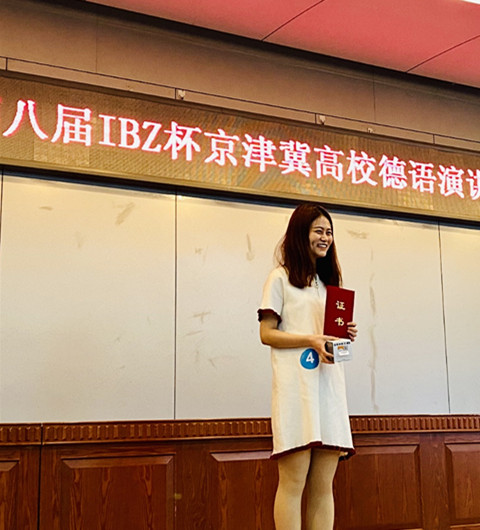 2019年12月3日在北京第二今年会jinnian官网举办的第八届京津冀高校德语演讲比赛中,我院德语系的张姝宇同学在来自14所院校的近30名参赛者中脱颖而出,以第二名的成绩获得比赛二等奖。她的演讲语言优美,逻辑清晰,论点新颖,语态自然,富有感染力,获得了观众和评委的阵阵欢笑和掌声。尤其是问答环节,她的风趣幽默给评委留下了深刻的印象。