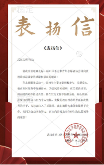 青春奉献,敢为人先,他连续三年在家乡和平村党员活动中心,担任志愿者,参与一线挖沟抗旱工作。在武汉市硚口手志梦青年志愿者协会,助力为聋人朋友打开心结,发布30余篇文章,呼吁公众对残疾人的理解和关爱。今年9月获该单位的表扬信。登湖北日报、孝感日报等主流媒体,曾被孝感市教育局和团委评为“最美孝德青少年”榜首,今年9月底,被孝感日报记者邀请专访,宣传“融文汇理,立德树人”的精神。