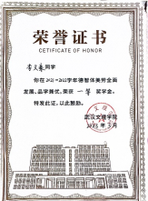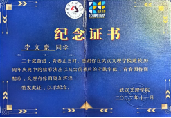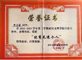 李文豪4次获得“优秀学生干部”、获“优秀学生干部标兵”。在担任21届大学生记者团秘书长期间,参与宣传20周年校庆(独立完成校庆PPT)、文理群星五四表彰、毕业典礼、智能制造与无损检测学院成立等多项活动,获优秀宣传先进个人称号。参与校史编辑,收获20周年纪念证书。