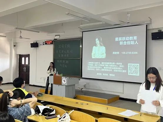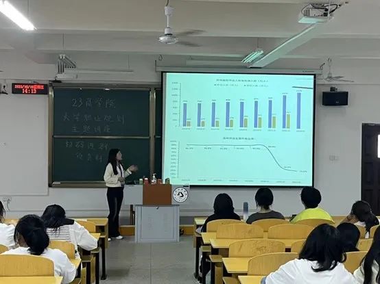 在分享会上,周老师根据历年毕业生就业率和考研率对大学生职业规划也进行了讲解。周老师结合自身经历向同学们提出合理规划时间的建议,鼓励大家刻苦学习,不辜负自己的抱负和未来。