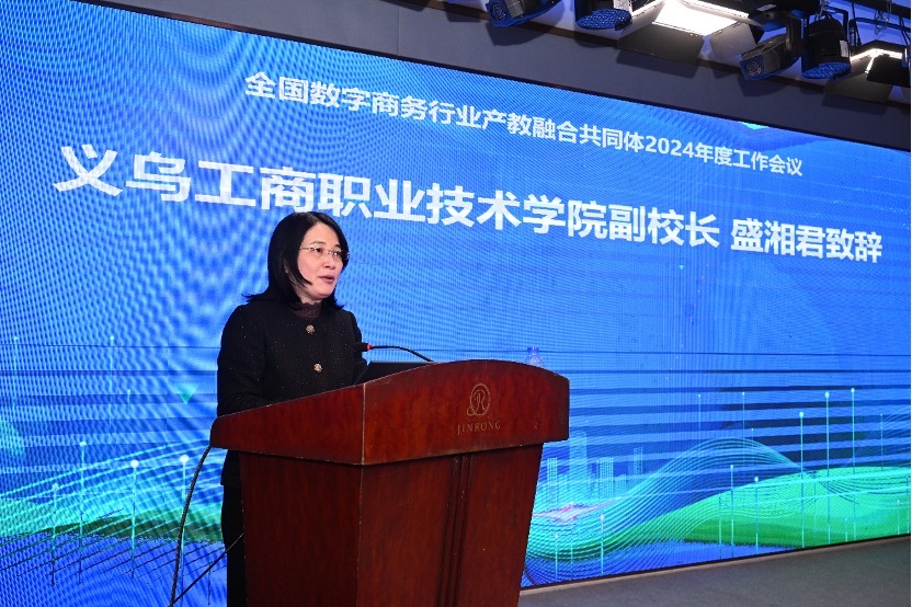 会议首先由主办方义乌工商职业技术学院副院长盛湘君致辞,盛院长指出,全国数字商务行业产教融合共同体是“数商开放行动战略”的重要一步,高校在共同体中应发挥人才智库作用,培养企业真正需要的数字商务人才。
