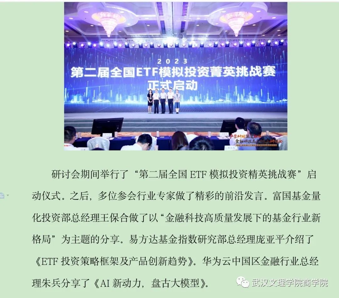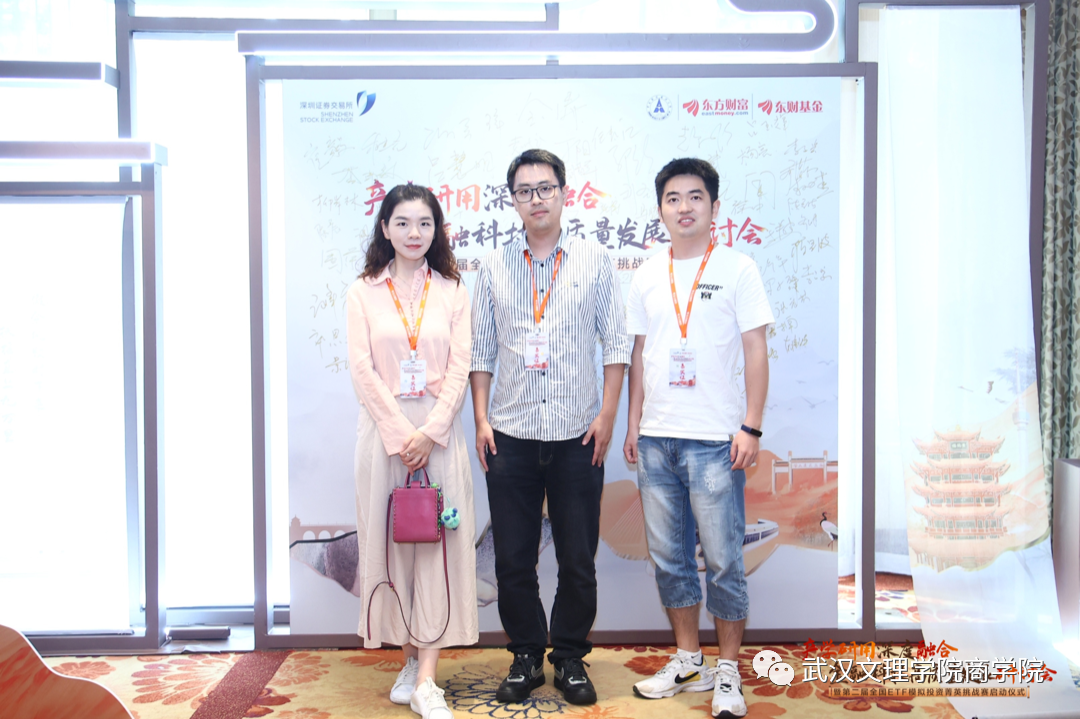 8月11日,为了解业界新技术和企业用人新需求,切实推进校企合作,加大产教融合步伐,优化应用型人才培养体系,拓展taptap竞彩足球实习实践基地,taptap竞彩足球教学副院长刘炫、投资系主任刘圣龙、副教授汪笛晚在武汉应邀参加了由深圳证券交易所指导,中南财经政法大学、东方财富、东财基金联合主办的“产学研用深度融合 金融科技高质量发展”研讨会暨2023年第二届全国ETF模拟投资菁英挑战赛启动仪式。
